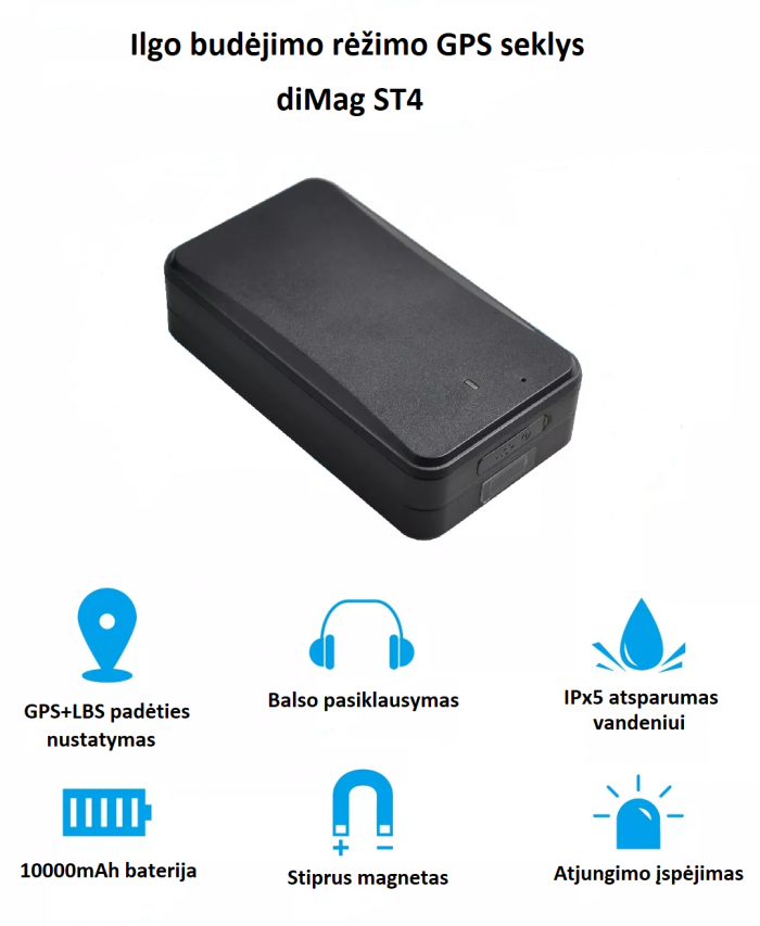 Daugiau jokių kabelių ar išorinių maitinimo šaltinių. Šis įkraunamas GPS įrenginys turi 10000mAh vidinę bateriją, kuri leidžia įrenginiui intensyvaus darbo rėžimu veikti iki 8 dienų. Baterijos našumas darbo režimu: 30 dienų (veikiant po 2 val. per dieną). Budėjimo laikas: iki 2.5 metų. Mažas ir lengvai tvirtinamas GPS įrenginys gali būti naudojamas transporto priemonių, krovinių, didelės vertės turto saugumo užtikrinimui ir sekimui.